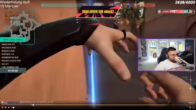 16:05:15Das Gameplay ist von hoher Anspannung und Chaos geprägt. In entscheidenden Momenten wird der Streamer von Gegnern überrascht und früh eliminiert. Er versucht, seine Mitspieler zu koordinieren, doch es kommt zu wiederholten Fehlern und Missverständnissen. Trotzdem zeigt der Streamer Kampfesgeist und versucht, die Runde zu drehen, was jedoch scheitert.