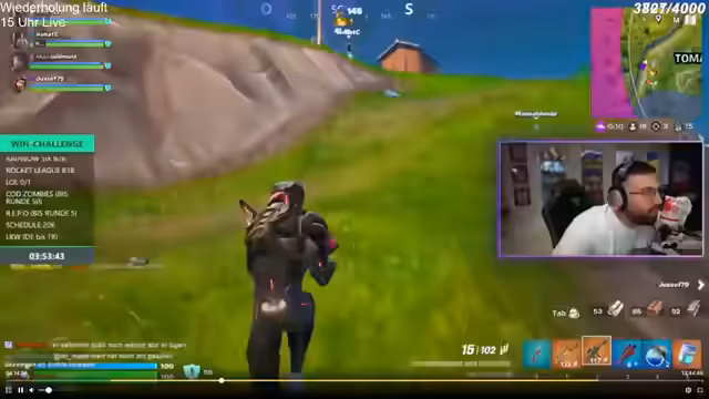 15:18:38Der Streamer und seine Teammitter konfrontieren sich mit einem Gegner, der aggressiv Granatenwerfer einsetzt. Mehrfach wird der Streamer von diesen Waffen überrascht und eliminiert. Im Team gibt es Missverständnisse und Taktikfehler, wie das unkoordinierte Bauen und das Nichteinhalten von vereinbarten Positionen. Der Streamer äußert sich frustriert über den Druck und die unkoordinierten Aktionen des Gegners und der eigenen Mitspieler.
