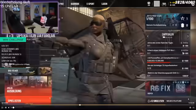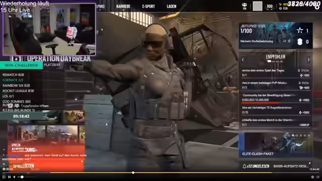 04:51:19Aufgrund der anhaltenden Probleme mit Warzone wechseln die Streamer zu Rainbow Six Siege. Auch hier stoßen sie auf erhebliche technische Hürden. Das Spiel muss heruntergeladen werden, was sehr lange dauert. Die Wartezeiten auf eine Lobby sind extrem lang, und die Streamer sind genervt. Auch die Steuerung und das Gameplay in Rainbow Six Siege bereiten Schwierigkeiten.