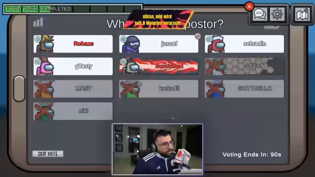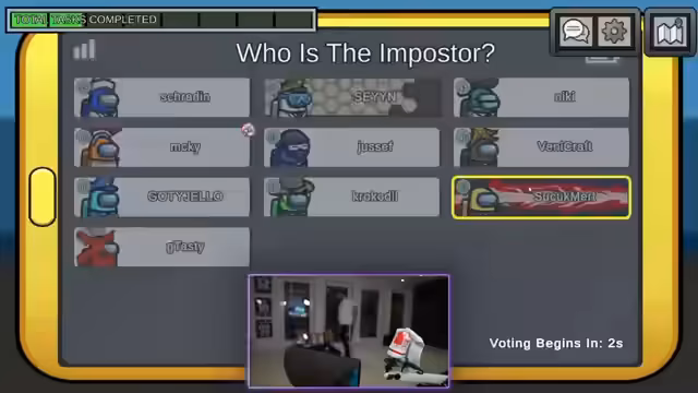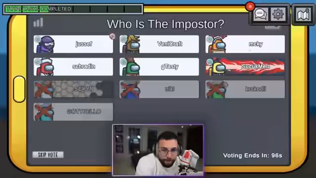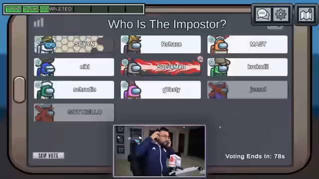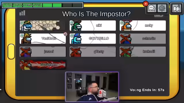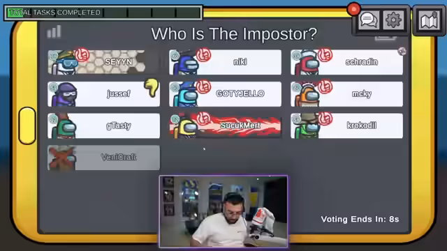 00:34:38In den folgenden Runden kommt es zu vermehrten Vorfällen, bei denen die Spieler zu vorschnell voten und sich gegenseitig beschuldigen. Ein Spieler verwendet möglicherweise Cheats, wodurch die Verfolgung des Imposters erschwert wird. Es entsteht eine große Verwirrung, als in einer Runde ein Mitspieler umgebracht wird, während alle zusammen waren, was zu unzähligen Theorien und gegenseitigen Vorwürfen führt. Die Zusammenarbeit der Crewmates bricht teilweise zusammen, da die Kommunikation chaotisch wird.