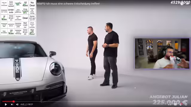 03:43:34Im Stream wird ausführlich über die hohe Summe von 225.000 Euro für den Porsche 911 Turbo S diskutiert. Streamer Julian betont, dass es sich um ein gewaltiges Investment handelt, mit dem man in vielen deutschen Großstädten eine Dreizimmerwohnung erwerben könnte. Er vergleicht die Anschaffung des Autos mit anderen potenziellen Investitionen wie dem Kauf eines Hauses, der Eröffnung eines Ladens oder einer Shisha-Bar, die langfristig einen höheren Nutzen bringen könnten. Streamer Omid diskutiert die 10%-Regel beim Autohandel und erläutert, warum er das Auto für mindestens 225.000 Euro verkaufen müsste, aber realistisch nur 220.000 bis 225.000 Euro erwarten kann. Die finanzielle Dimension des Autohandels und der Wertverlust werden hier zentral beleuchtet.