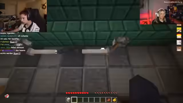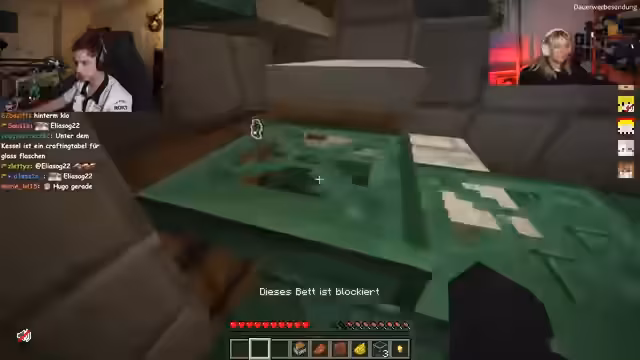 03:54:52Hugo ist verwirrt und fragt sich, ob er etwas in die Umgebung legen muss. Er hat bereits in einem Rollenspiel seine Zelle sauber halten müssen, was auch das Entfernen von Blättern beinhaltete. Basti hatte ihn angewiesen, seine Zelle sauber zu halten, was Hugo dazu bringt, über das verrottete Fleisch nachzudenken und es zu essen, wodurch ein Sound ausgelöst wird. Er entdeckt einen versteckten Ofen und nimmt Blätter vom Boden auf. Die Zuschauer diskutieren über Hugos Ansätze und seine Schwierigkeiten, das Crafting-Menü richtig zu nutzen. Er versucht, mit Glasblöcken etwas zu craften. Hugo setzt sich hin, was als kreativer Lösungsansatz gewertet wird, obwohl er die Mechanik mit dem Schöpfer nicht sofort versteht. Er überlegt, ob er die Toilette abbauen darf und findet eine Werkbank, auf die er aber nicht zugreifen kann. Er vermutet, dass ein Kupferteil fehlt und ist frustriert, da er nicht weiterkommt.