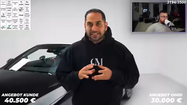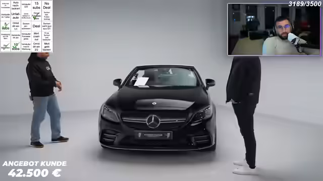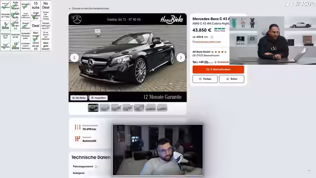 00:00:41Der Stream beginnt mit einer Diskussion über ein bevorstehendes Fußballspiel und die Erwartung einer möglichen Niederlage. Anschließend wechselt das Thema abrupt zu einer Fahrzeugbewertung, bei der ein Mercedes C43 AMG Cabriolet vorgestellt wird. Das Auto gehört Sebastian aus Frankenthal, Baujahr 2020, mit 390 PS und einem Kilometerstand von etwa 91.000. Sebastian stellt sich vor und gibt an, dass er das Fahrzeug für 42.500 Euro verkaufen möchte. Die erste Einschätzung des Fahrzeugs wird vorgenommen, wobei der Preis als potenziell zu hoch empfunden wird, insbesondere im Vergleich zu ähnlichen Modellen auf dem Markt. Es wird erwähnt, dass der C43 AMG oft unterschätzt wird, obwohl er eine gute Leistung bietet und als beliebtes Fahrzeug gilt. Die Diskussion dreht sich auch um die Notwendigkeit eines C-Klasse AMG im Vergleich zu einem C 300 und die Preisvorstellungen. Es wird ein "Omid Kauf Bingo" gestartet, um die Spannung zu erhöhen.