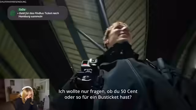 02:01:09Die Ankunft in Berlin markiert den Beginn der städtischen Herausforderungen. Eine wichtige Begegnung findet auf der Toilette statt, nachdem die Streamerin von jemandem mit ihrem Schild erkannt und angesprochen wurde. Ein Autohelfer bietet direkte Unterstützung und fährt sie sogar zur Stadtmitte, was eine entscheidende Hilfe für die Fortbewegung darstellt. Die Nutzung der öffentlichen Verkehrsmittel ohne Ticket und die strategische Platzierung des Schilds werden als Erfolge gewertet, um Aufmerksamkeit zu erzeugen und Hilfe zu bekommen.