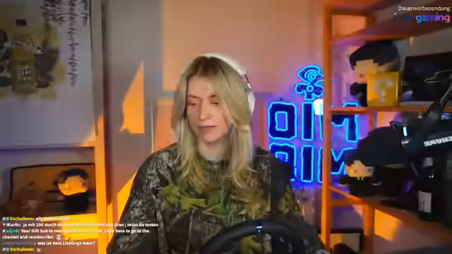 02:29:22Die Streamerin startet eine offene Lobby für ein Rennen. Vor dem Start muss sie jedoch mehrere technische Einstellungen anpassen, wie die Kamera, die Schaltbefehle und die Traktionskontrolle, die sie auf 'Mittel' stellt. Das Rennen selbst verläuft für sie holprig: sie wird in der ersten Kurve gedreht, kämpft mit dem ungewohnten manuellen Schalten und kann nicht mit den schnelleren Teilnehmern mithalten. Die Stimmung ist gemischt aus Frust über die eigene Leistung und dem Wunsch, die Einstellungen für zukünftige Rennen zu optimieren.