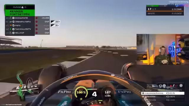 00:19:40Nachdem sie eine Lobby mit anderen Spielern gefunden hat, startet das Rennen. Die Streamerin gerät früh in Schwierigkeiten, da ihr Frontflügel bei einem Zusammenstoß beschädigt wird, was das Handling ihres Autos stark beeinträchtigt. Trotzdem kämpft sie weiter, überholt einige Gegner und steigt in der Wertung nach oben. Allerdings wird sie später in eine Kollision verwickelt, die sie weit zurückwirft. Sie zeigt sich frustriert über die ruppige Fahrweise anderer Teilnehmer und den eigenen technischen Nachteil durch den kaputten Flügel.