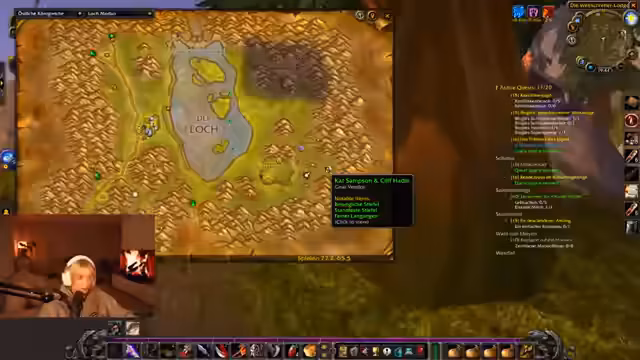 00:24:06Der thematische Fokus des Streams verschiebt sich vollständig zum gemeinsamen Spielen von World of Warcraft. Die Streamerin koordiniert mit einem anderen Spieler namens Kuba das gemeinsame Leveln in der Zone Loch Modan. Dabei kommt es zu technischen Schwierigkeiten beim Handeln von Gegenständen und bei der gemeinsame Annahme von Quests, was den Spielverlauf verlangsamt.