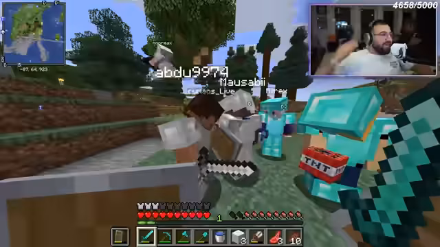04:19:18Nach der Niederlage bereitet sich die Gruppe auf einen neuen Angriff vor. Sie lagern wertvolle Gegenstände in Truhen und planen, mit Eisen bewaffnet zurückzuschlagen. Ein Spieler erwähnt, er habe privat eine schnelle TNT-Bombe trainiert, die er nachts einsetzen will. Ziel ist es, Trimax zu überfallen, während deren Verbündete schlafen. Gleichzeitig wird über mögliche Deals mit anderen Spielern wie Zane nachgedacht, um Ressourcen zu sichern.
