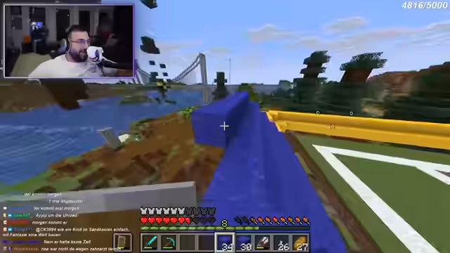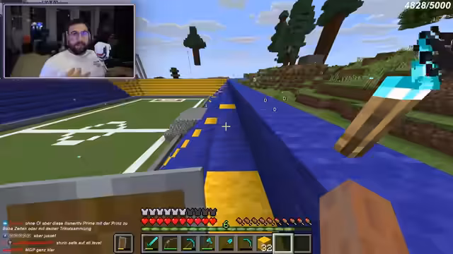 17:41:56Das Team plant größere Bauvorhaben, darunter ein Fußballstadion und eine osmanische Burg. Diskussionen drehen sich um Design, Größe und Farben (weiß, blau, gelb) des Stadions ('50x25 Blöcke'), wobei der Streamer Berechnungen anstellt und kritisiert, dass andere Spieler Ressourcen stehlen. Gleichzeitig werden Pläne für einen 'Männerabend' und weitere Projekte wie einen Fluss und ein 'Totemfahren' geschmiedet.