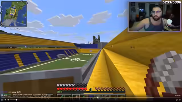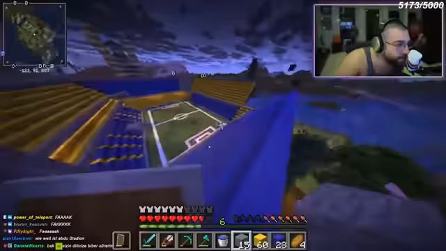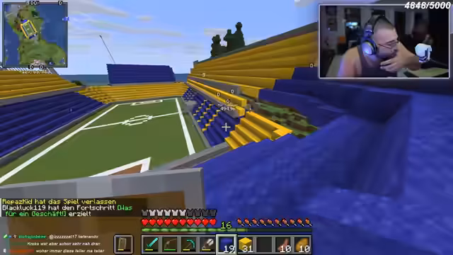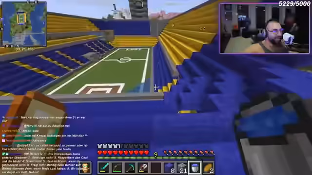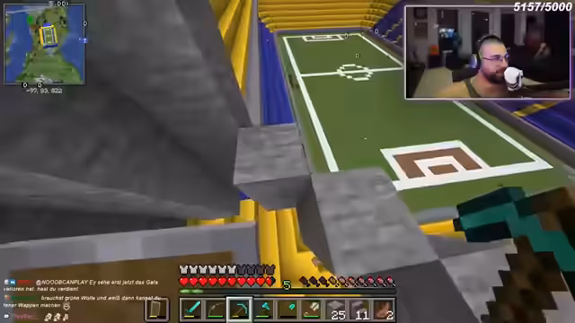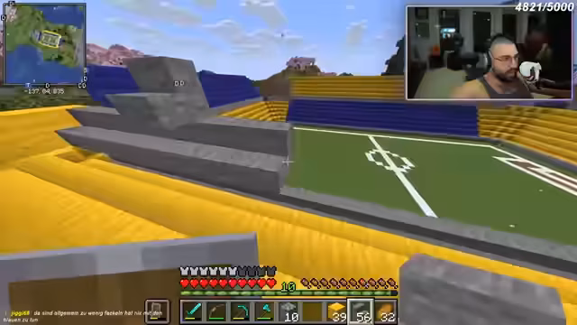 19:27:58Zu Beginn des Streamabschnitts tauchen der Streamer und seine Mitstreiter in ein chaotisches Stadion-Szenario im Minecraft-Server ein. Es kommt zu Diskussionen über verlorene Gegenstände, die Verteilung von Ausrüstung und der Bau eines Fußballfeldes. Die Stimmung ist unruhig und von einem mix aus Spiel und Missverständnissen geprägt, wobei der Streamer ungeduldig über den Fortschritt des Baus spricht und nach Materialien für den Weiterbau sucht. Gleichzeitig werden wiederkehrende technische Probleme erwähnt.