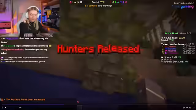 03:32:30Der Streamer erläutert die Spielregeln von Blitzhand, einem schnellen Hide-and-Seek-Spiel in Minecraft. Dabei verstecken sich Teams oder jagen als Hunter in acht Runden durch verschiedene zufällig generierte Karten. Jede Runde hat einen neuen Mittelraum plus acht zufällige Randräume, um faire Bedingungen zu schaffen. Die Hunter starten in einer Class-Tube mit Dunkelheitseffekt, während die Hider 20 Sekunden Zeit haben, sich zu verstecken. Danach haben die Hunter 90 Sekunden mit einem Sonar-Item, um Spieler aufzuspüren. Am Ende jeder Runde wechselt die Hunter-Rolle.