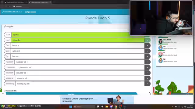 04:09:35Das neue Quiz-Duell beginnt mit einer Variante von Fragen, die in Kategorien wie Geografie, Sport und Tierwelt unterteilt sind. Die Spieler drücken auf einen Buzzer, um Antworten zu geben. Bei falschen Antworten gibt es Minuspunkte, während richtige Antworten volle Punkte bringen. Der Streamer moderiert die Runde, stellt die Fragen und gibt den Teilnehmern Zeit, ihre Antworten zu überlegen, um eine faire Atmosphäre zu schaffen.