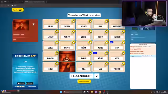 05:21:27Im Verlauf des Codenames-Spiels geben die Spieler kontinuierliche Hinweise, um ihre Wörter zu erraten. Der Streamer gibt strategische Ratschläge, z.B. dass man zwei Wörter gleichzeitig vorschlagen kann, und kritisiert die mangelnde Kommunikation innerhalb der Teams. Es kommt zu Fehlern, z.B. als ein Spieler versehentlich ein falsches Wort markiert, was zu Punktabzügen führt. Trotzdem wird das Spiel als „geiles Rennen“ bezeichnet und mit Spannung verfolgt.