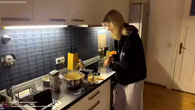00:10:02Nachdem der Ofen vorgeheizt wurde, beginnt die Streamerin, die Zutaten nach einem freien Rezept zu vermischen. Sie fügt neben den Bananen und Mehl auch Agavendicksaft, Backpulver, Vanillezucker und Haferflocken hinzu. Um die Konsistenz zu verbessern, wird Hafermilch hinzugefügt. Ein Teil des Teigs wird mit Schokodrops vermischt, und die Streamerin entscheidet sich spontan, auch geriebene Äpfel unter den Teig zu heben, um eine gesunde und fruchtige Komponente zu integrieren.