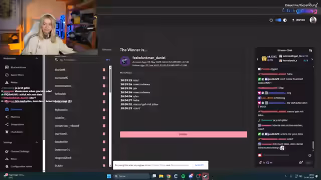 01:51:54Die Auslosung der Gewinner erfolgt live im Chat mittels Zufall. Die erste Runde ergibt als Gewinner die User „Lutz“ und „Bennett“. Ein weiterer Gewinner, „Runi“, wird ermittelt. Unangemessene Kommentare, insbesondere respektloses Verhalten gegenüber der Streamerin, führen zur Disqualifikation. Die Gewinner müssen ihre Bereitschaft zur Teilnahme in Köln bekräftigen.