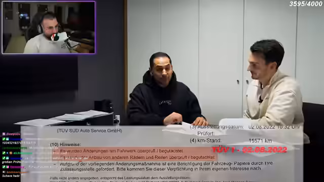 02:27:06Die Streamer konfrontieren den verantwortlichen TÜV-Prüfer direkt vor Ort mit der Diskrepanz zwischen den beiden Prüfergebnissen. Sie legen dar, dass der Händler das Fahrzeug ohne die festgestellten Mängel verkauft hat und die Käufer seither mit dem Auto Probleme haben. Außerdem weisen sie auf einen Zeitverknüpfungsfehler in den Unterlagen hin: Eine Begutachtung und die Hauptuntersuchung fanden angeblich am selben Tag statt, wobei der Bericht nur zwei Minuten nach der Begutachtung erstellt wurde, was unmöglich erscheint.
