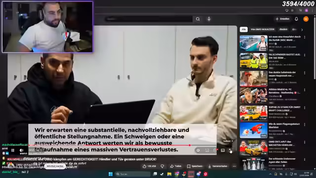 02:36:03Nach der Konfrontation fahren die Streamer zurück ins Studio und formulieren eine offizielle E-Mail an den TÜV Süd. Darin schildern sie den Fall ihrer Zuschauerin Emily, die einen teuren Unfallwagen mit einem vorgeblich einwandfreien TÜV-Bericht gekauft hat. Sie werfen dem TÜV vor, bei der Prüfung versagt zu haben, fordern eine öffentliche Stellungnahme und kündigen an, den Fall weiter zu verfolgen, um das Vertrauen in den TÜV wiederherzustellen.