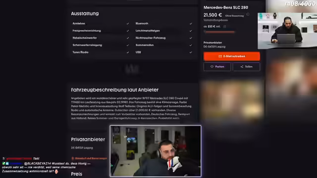 00:55:17Die Verhandlung um Joey Kellys Mercedes SLC 280 beginnt mit einem starken Unterschied zwischen den geforderten 22.500 Euro und dem angebotenen Sicherheitspreis von 12.500 Euro. Der Streamer betont, dass der Wagen in seinem Zustand ein Kostenwrack sei, dessen Reparaturkosten den Marktwert weit übersteigen. Eine Recherche auf Mobil.de zeigt vergleichbare Fahrzeuge für etwa 15.000 Euro, was sein Angebot untermauert. Der Zustand des Fahrzeugs wird kritisch analysiert: es fehlt eine durchgehende Lackierung, alle Dichtungen sind undicht, der Rostbefall ist erheblich und Chromelemente sind verzogen.