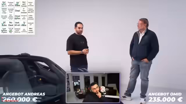 04:55:32Die finale Verhandlung zwischen dem Streamer und Andreas wird als authentisch und fair beschrieben, nachdem beide sich kennengelernt haben. Andreas ist fest vom Wert seines Autos bei 280.000 Euro überzeugt, während der Streamer maximal 240.000 Euro zu zahlen bereit ist. Nach einer langen, transparenten Auseinandersetzung, in der der Streamer seine Marktanalyse detailliert darlegt, einigen sich beide auf einen Kompromiss. Der最终preis wird auf 247.500 Euro festgelegt. Andreas erhält sofort das Geld und kann den Wagen loswerden, während der Streamer einen profitablen Wiederverkauf erwartet.