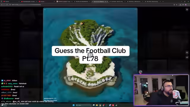 00:08:01Der Fokus verschiebt sich auf ein neues Quiz, bei dem der Streamer alte Fußballclub-Logos erraten muss. Während einige Logos wie 'BVB', 'Liverpool' oder 'Chelsea' schnell identifiziert werden, gestaltet sich das Erraten anderer Logos, wie 'Real Betis' oder 'Atalanta Bergamo', als sehr schwierig und führt zu viel Überlegung und Fehlversuchen.