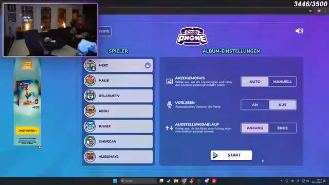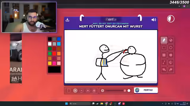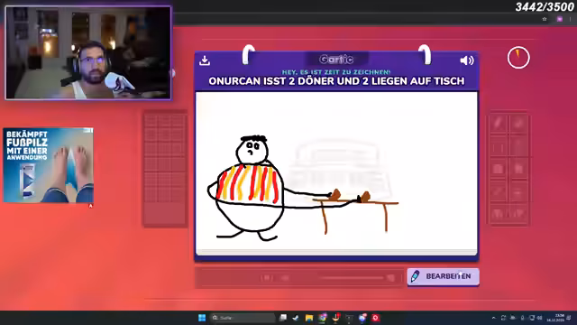 08:58:07Die Teilnehmer spielen eine weitere Runde des Zeichenspiels und überlegen, den Anonym-Modus zu nutzen, um die Identität der Zeichner zu verbergen. Es wird vorgeschlagen, in den Fullcam-Modus zu wechseln und Sätze zu schreiben, die dann von anderen gezeichnet werden. Die Idee, sieben Züge pro Zeichnung zu erlauben, wird diskutiert, um mehr Details zu ermöglichen. Es kommt zu einer kontroversen Situation, als ein Teilnehmer einen unangemessenen Satz schreibt, der zu Problemen führen könnte. Die Gruppe beschließt, den Anonym-Modus zu deaktivieren und das Spiel mit normalen Kameras fortzusetzen, um weitere Eskalationen zu vermeiden. Die Teilnehmer äußern ihren Wunsch nach lustigen, aber nicht beleidigenden Zeichnungen und betonen die Bedeutung von Spaß am Spiel.