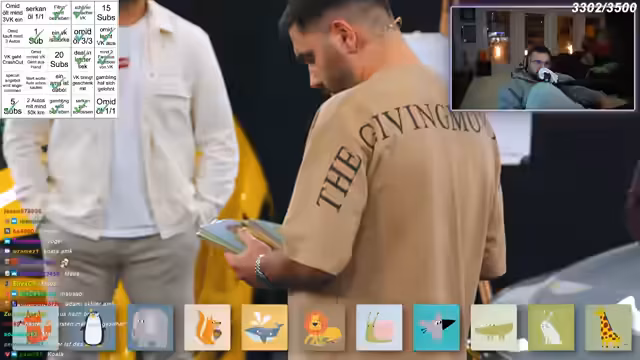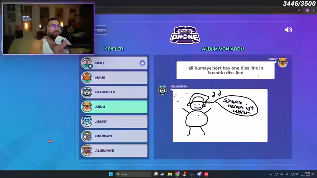 08:35:53Nachdem die erste vollständige Runde von Scribble beendet ist, werden die Ergebnisse präsentiert. Die Spieler sehen, wie ihre ursprünglichen Sätze durch Zeichnungen und nachfolgende Interpretationen verändert wurden. Es gibt viel Gelächter und Erstaunen über die kreativen, manchmal aber auch völlig falschen Darstellungen und Beschreibungen. Beispiele wie 'Abdu im Fennel Trikot' oder 'Ali bei Nas Chicken' werden gezeigt, und die Spieler kommentieren die Zeichnungen und die daraus entstandenen Missverständnisse. Die Runde wird als unterhaltsam und lustig empfunden, obwohl einige Spieler ihre Enttäuschung über ihre eigenen Zeichnungen oder die Interpretationen der anderen äußern. Die allgemeine Stimmung ist positiv, und es wird der Wunsch geäußert, das Spiel fortzusetzen, möglicherweise mit angepassten Regeln, um längere Ketten von Zeichnungen und Beschreibungen zu ermöglichen.