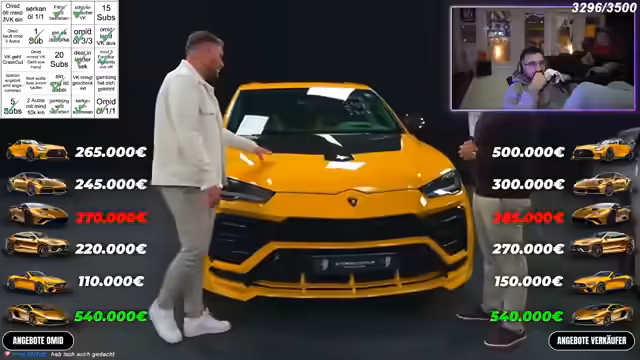 00:02:31Der Stream beginnt mit der Vorstellung eines Lamborghini Aventador SVJ. Der Wagen, Baujahr 2019, hat lediglich 8.000 Kilometer auf dem Tacho und befindet sich in dritter Hand, wobei die Mehrwertsteuer ausweisbar ist. Trotz des geringen Kilometerstands sind vier neue Reifen und eine Reparatur der Lippe für 3.000 Euro notwendig. Das Fahrzeug ist scheckheftgepflegt und wurde ausschließlich bei Lamborghini gewartet. Der Verkäufer ruft einen Bruttopreis von 600.000 Euro auf, was angesichts der Seltenheit von nur 42 Stück des SVJ als angemessen erscheint. Es wird jedoch diskutiert, dass der Einkaufspreis für den Händler niedriger sein müsste, um einen Gewinn zu erzielen. Ein Gegenangebot von 500.000 Euro wird gemacht, was als hart empfunden wird.