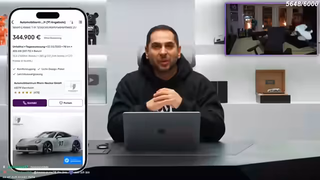 00:36:36Das Thema wechselt zu Luxusautos in Dubai. Der Streamer besichtigt einen Porsche GT3 und analysiert dessen Details: Er bewertet die Lackierung, den Innenausbau mit roten Sitzen und den Kilometerstand. Er diskutiert Importkosten nach Deutschland und den Wertverlust. Ein Porsche 911 GT3 wird für 75.000 Euro bewertet, wobei der Streamer den fehlenden Spoiler kritisiert. Der Markt für importierte Fahrzeuge aus Dubai wird als lukrativ beschrieben.