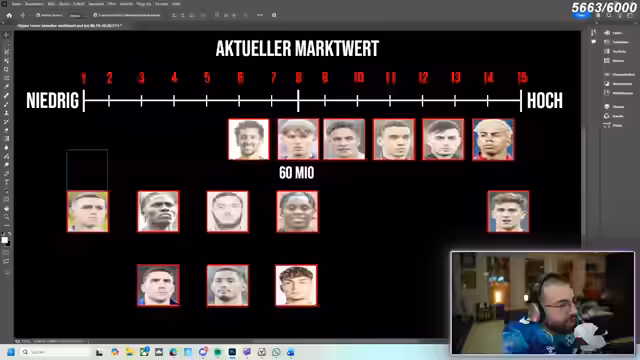 05:29:26Das Spiel wechselt zur Einordnung von Spielern basierend auf ihren Marktwerten im Vergleich zu Lennart Karl (60 Millionen). Die Teilnehmer ordnen Spieler wie Kenan Yildiz, Arda Güler, Musiala, Pedri und Marquinhos in eine Rangliste ein. Falsche Platzierungen führen zu Diskussionen und Ausfällen von Spielern. Der Streamer moderiert die Runde und vergibt Punkte für korrekte Einschätzungen.
