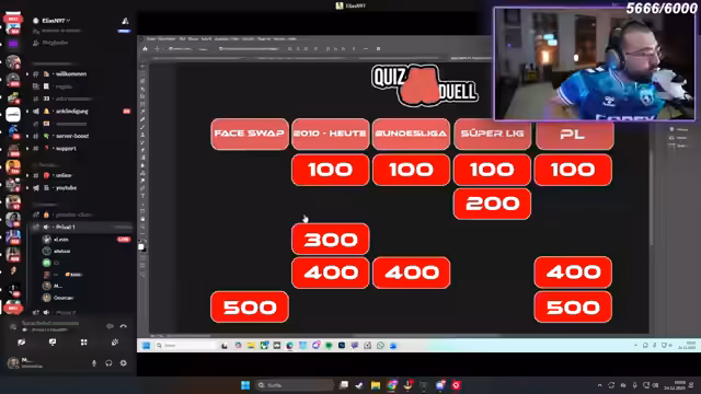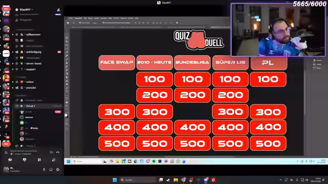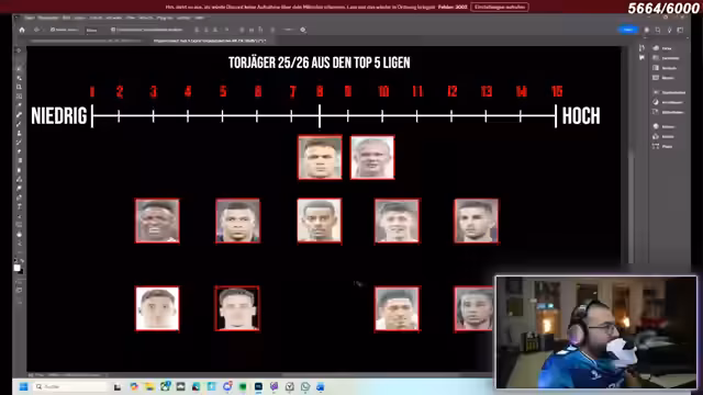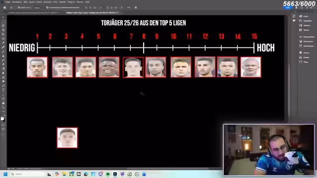 05:43:23Eine neue Runde beginnt mit der Aufgabe, aktuelle Torschützen aus den Top-5-Listen zu nennen. Namen wie Haaland, Martinez, Vinicius Junior und Bellingham werden diskutiert. Später folgt eine Runde zur Einordnung von Spielern nach Marktwerten, bei der auch weniger bekannte Namen wie Frimpong und Cherki bewertet werden. Der Streamer kommentiert die Ergebnisse und reagiert auf die Leistungen der Teilnehmer.