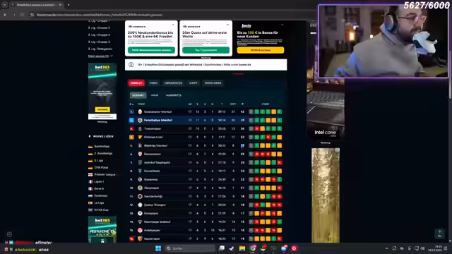 06:08:20Der Streamer wechselt die Spielkategorie zu 'League' und stellt schwierige Fragen zur Türkei und anderen europäischen Ligen. Die Teilnehmer müssen spezifische Wissensthemen wie Aufsteiger, Meisterschaften und Spielertransfers beantworten. Hierbei kommt es zu emotionalen Aussprachen, als falsche Antworten zu Minuspunkten führen. Besonders diskutiert wird die Identität von Spielern wie O7 und Urcan Çakır, wobei die Teilnehmer ihre fußballfachlichen Kenntnisse unter Beweis stellen müssen.