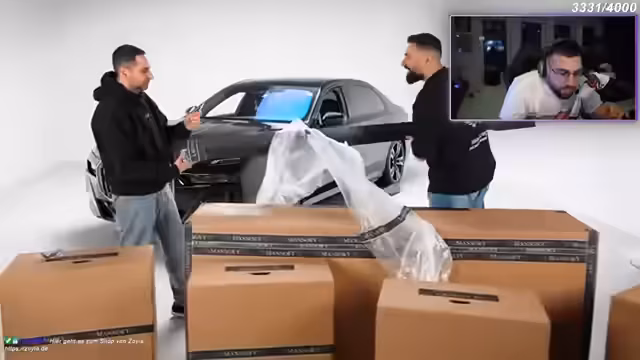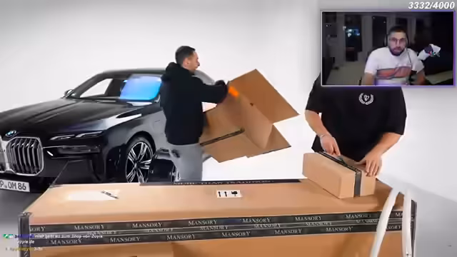 00:01:44Der Stream beginnt mit der Ankündigung eines umfangreichen Umbaus für einen 7er BMW, in den rund 100.000 Euro investiert werden. Der Streamer stellt stolz die umfangreichen Teile von Mansory vor, die frisch produziert und verpackt angeliefert wurden. Nachdem die Kartons mit Aufwand ausgepackt wurden, werden die ersten großen Carbon-Teile wie Seitenschweller präsentiert. Die Begeisterung über die hochwertigen und teuren Komponenten ist spürbar, da der Streamer die Teile wie Weihnachtsgesüre für Autoenthusiasten beschreibt.
