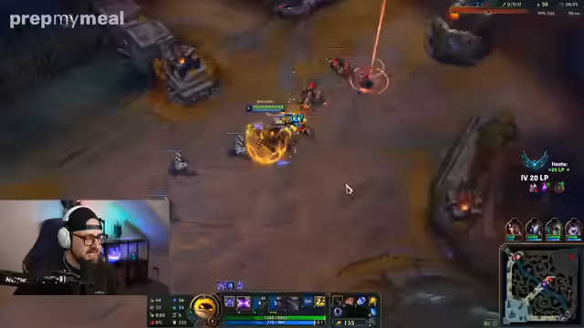 01:34:11Der Stream beginnt mit intensiven Spielgeschehen in der League-of-Legends-Partie. Der Streamer kommentiert die aggressive Spielweise des Gegners und seine eigene Positionierung in der Lane. Er versucht, eine vorteilhafte Position zu halten, während sein Team Druck ausübt. Der Gegner wird als sehr stark und schadensreich beschrieben, was zu Bedenken führt. Der Chat wird zur Unterstützung mobilisiert, um das Team zu motivieren und zu organisieren.