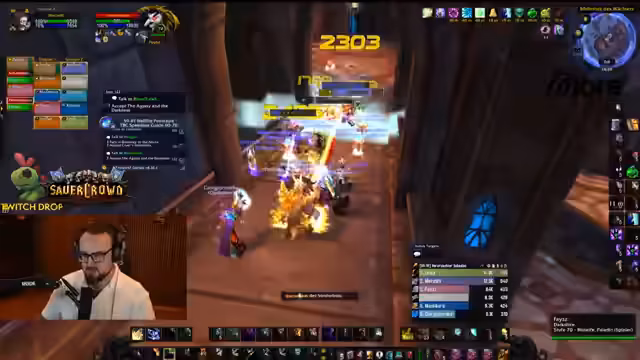 01:43:05Zu Beginn des Streamings steht die Vorbereitung im Fokus. Der Streamer plant einen Raid um 12 Uhr und sammelt Elementarfeuer, wofür er sich im Spiel bewegt und um Unterstützung bittet. Interaktivität mit dem Chat wird großgeschrieben, wobei Follows von Zuschauern wie Mrs. Apfelkuchen und Axidius Katar erwähnt werden. Eine launische und teils vulgäre Stimmung im Chat wird thematisiert, wobei der Streamer darauf hinweist, dass sein Sohn neben ihm sitzt und er sich des Inhalts bewusst ist.