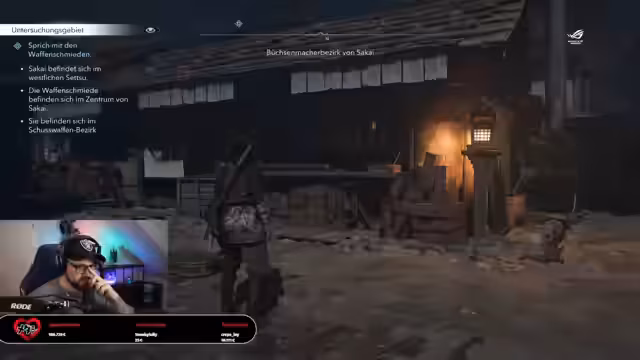 03:01:10Es wird eine Mission begonnen, bei der die Waffenschmiede belauscht werden müssen. Dabei werden geheime Informationen über Verträge mit Portugiesen und Lieferungen nach Tanagashima aufgedeckt. Die Waffenschmiede werden zur Rede gestellt, aber sie weigern sich zu kooperieren und fliehen. Der Streamer verfolgt und tötet die Waffenschmiede mitten auf der Straße, ohne dass es jemanden kümmert. Anschließend wird mit Imae Tsukyo gesprochen, um die Mission fortzusetzen. Der Streamer sucht nach Imae Tsukyo im südwestlichen Sakai und nimmt dabei einen Aussichtspunkt ein. Es wird ein Zuschauer erwähnt, der an Krebs erkrankt ist und durch den Stream Erleichterung findet. Der Streamer zeigt Mitgefühl und wünscht dem Zuschauer alles Gute. Es wird eine Spende von 500 Euro für krebskranke Kinder erwähnt, und der Streamer bedankt sich herzlich beim Spender. Der Streamer setzt die Suche nach Imae Tsukyo fort und verirrt sich in der Stadt. Es wird festgestellt, dass die Stadt auf Schiffen gebaut ist, was ungewöhnlich ist.