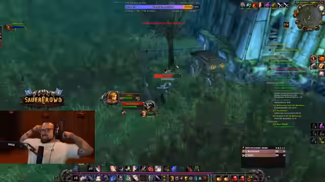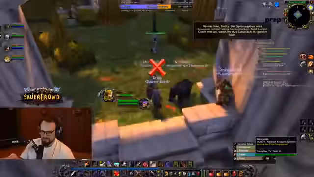 12:09:37Der Endboss, 'Totenkopf', stellt die Gruppe vor eine große Herausforderung, da er einen Massen-Betäubungs-Zauber wirkt. Streamer führt einen präzieren Call an: Danny soll sofort mit 'spöttischer Schlag' auf den Boss ziehen, während er selbst 'Gegenschlag' einsetzt, um den ersten Stun zu überleben. Die Gruppe konzentriert sich primär auf den Boss und kontrolliert die übrigen Monster durch kontrollierte Ziehung und Frost-Novas, um den Kampf zu überstehen.