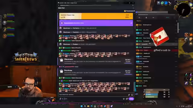 00:13:12Nach einer längeren Abwesenheit und sichtbaren Anstrengungen, die Stream-Software wieder zu ordnen, wird der Streamer wieder sichtbar. Er beginnt mit einer Reihe von Grüßen und Danksagungen an die Chatmitglieder, die nach seiner Rückkehr geflutet sind. Ein großes Thema ist das enorme Wachstum des Kanals, das seit Beginn des Events über 35.000 neue Follower gebracht hat. Um dieses Wachstum weiter anzukurbeln, wird ein neues Giveaway für ein halbes Jahr WoW Spielzeit angekündigt, nachdem der Gewinner des vorherigen Giveaways sich für Guthaben entschieden hatte.