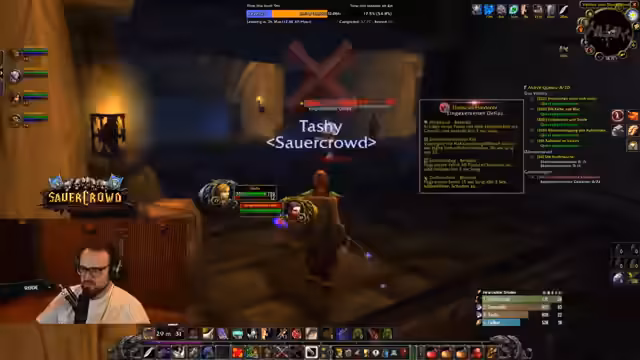 07:44:39Nach dem Betreten des Dungeons Burg Schattenfang werden die ersten Mobs bekämpft. Der Streamer beschreibt eine anstehende Begegnung mit dem Boss 'Son of Arugle' und äußert Zuversicht, diesen aufgrund der hohen Level der Gruppe besiegen zu können. Es werden strategische Ansätze für die Kämpfe besprochen, wie z.B. das Nutzen von Fähigkeiten wie 'Frostnova' und das Verteilen von 'Mistelzweigen' auf alle Gruppenmitglieder zur Vorbereitung auf den Dungeon-Verlauf.