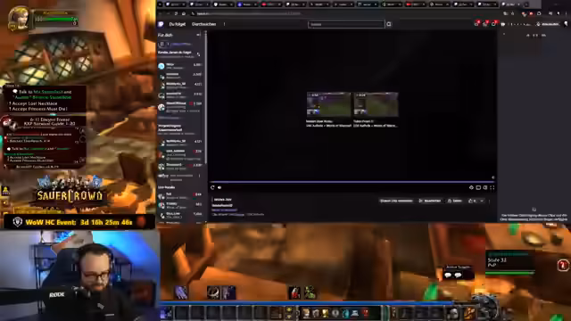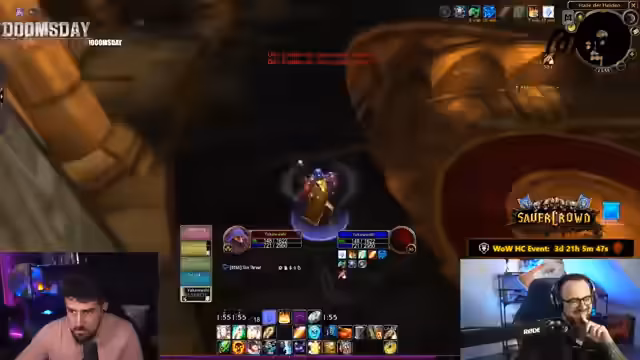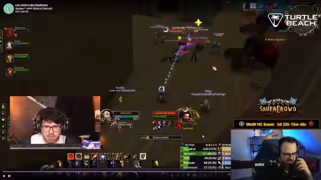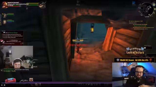 01:40:14Während des Streams wird ein Clip von einer World of Warcraft Classic Hardcore-Session gezeigt, bei der die Gruppe an einem Mob scheitert. Der Streamer analysiert den Fehler und kritisiert, dass in den Deadmines das Springen auf ein Rad möglich ist, was er als 'Arschloch' und eine Design-Schwäche ansieht. Er hebt jedoch hervor, dass es sich bei den Spielern um Anfänger handelt und es eine 'gute Leistung' ist, bis zum Endboss zu kommen, was einen Lernprozess darstellt.
