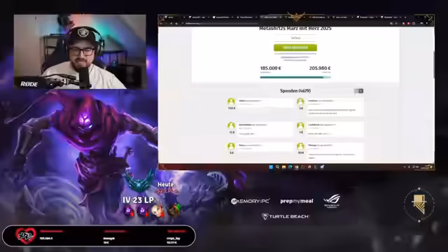 01:43:14Unmittelbar nach einem verlorenen Spiel kündigt der Streamer ein Giveaway im Wert von 25 Euro an, um die Interaktion im Chat zu steigern. Als Begründung wird die laufende Charity-Aktion 'MÄRZ MIT HERZ' erwähnt, die seit fünf Jahren für krebskranke Kinder sammelt. Der Streamer betont die enorme Summe von bereits 928.000 Euro Gesamtspenden und ruft die Zuschauer auf, durch Spenden oder zumindest durch Teilnahme am Giveaway das Projekt zu unterstützen. Der Fokus liegt auf der Charity-Botschaft.