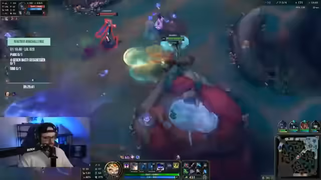 06:48:58Nach einer Unterbrechung setzt sich das Spiel fort. Ein Streamer erzielt durch einen Flash-Predictance ein spektakuläres Kill, was den Gewinn des Spiels sichert. Nach diesem Erfolg kündigt an, League of Legends als zentralen Fokus der ‚Win-Challenge‘ zu etablieren. Sie besprechen eine mögliche weitere Partie und wechseln auf einen Champion mit dem Namen Smolder, während das Team einen AP-Champion im Jungle wählt.