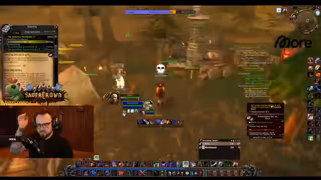01:56:29Nach Abschluss der Scholomanz-Quest wendet sich der Streamer einem anderen Bereich von Andorhal zu, dem 'Westwind-Ficklager', um nach Essenzen der Erde zu suchen. Die Gruppe nimmt eine eher chaotische Herangehensweise in Kauf und pullt mehrere Gegner gleichzeitig, was zu einem gefährlichen Kampf, aber auch zu einer hohen Drop-Rate für die Essenzen führt. Man diskutiert kurz ein bevorstehendes Event bei einem anderen Streamer, bei dem der Streamer anwesend sein wird.