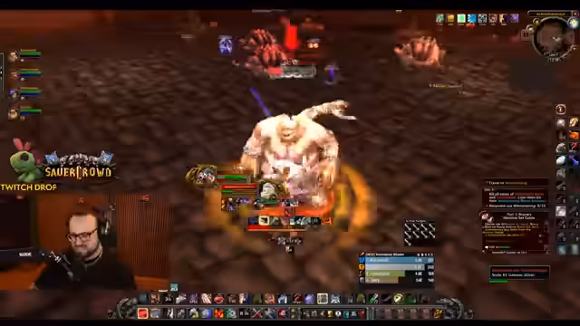 04:45:12Der Kampf gegen den Endboss beginnt. Die Spieler führen die geplante Strategie aus. Der Streamer als Tank nutzt sein Schild, um Schäden zu reduzieren und die Aggro zu halten, während die Heiler für das Überleben der Gruppe sorgen. Es werden spezifische Fähigkeiten wie 'Blutrausch' koordiniert und die Adds zügig eliminiert, um den Boss in Ruhe bekämpfen zu können.