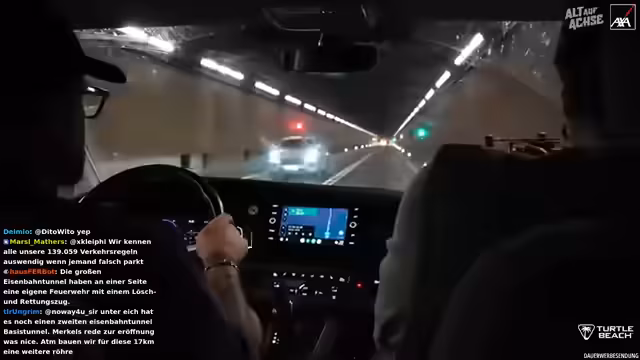 03:27:52Die durchgehende Internetverbindung während der Fahrt wird positiv hervorgehoben. Es wird betont, dass verantwortungsvoll gefahren wird und auf Straßenschilder geachtet werden muss. Dies wird durch eine extra gefahrene Strecke demonstriert. Die Verfügbarkeit von freien Zimmern im 'Hotel frei' wird erwähnt. Die Beschaffenheit der Hotels wird mit einem Gasthaus aus 'Herr der Ringe' verglichen. Es wird über rote Ampeln im Tunnel gesprochen, die verhindern sollen, dass man auf die linke Spur gerät, sowie über das Fehlen einer Wand in der Mitte des Tunnels, was mit Fluchtwegen und Rauchbildung erklärt wird. Die Anordnung von Telefonen und Fluchtwegen im Tunnel wird erläutert. Die Diskussion verlagert sich auf die Frage, was passiert, wenn ein Schwertransporter den Tunnel passiert und ob dieser dann geräumt wird. Die Wahrnehmung von Helligkeit am Ende des Tunnels wird diskutiert, bevor die frische Luft nach dem Verlassen des Tunnels begrüßt wird.