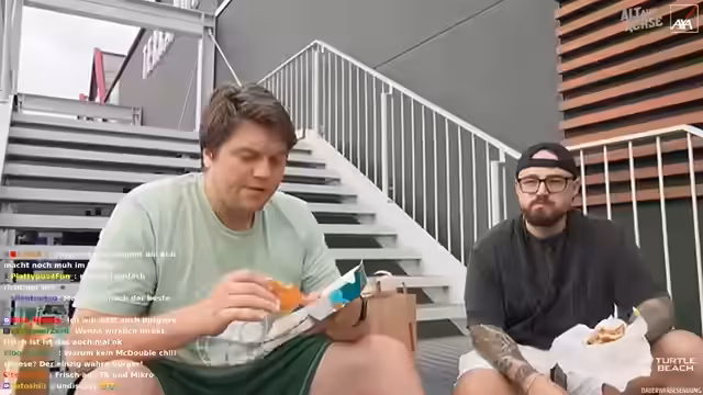 06:33:27Es wird scherzhaft angeboten, sich für drei Cheeseburger ausrauben oder entführen zu lassen. Die Gruppe lobt die Cheeseburger und diskutiert über den Ursprung des Namens 'Ricky Fries' oder 'Ricochet Fries'. Frederik wird für seine Bestellung gelobt, insbesondere für die Getränke. Es wird über die verbleibende Zeit und das Essen gesprochen. Jan bekommt Chili-Cheese-Nuggets und es wird über die Lieblingssoßen diskutiert. Es wird über die Unterkunft spekuliert und gehofft, dass es einen eigenen Jetski gibt. Es wird über einen Schmuddel-Film gesprochen und darüber, ob er ein Porno ist. Es wird festgestellt, dass es Chili-Cheese-Nuggets gibt. Es wird sich über die Sauberkeit im Camper beschwert. Es wird über einen neuen Follower-Alert gesprochen, bei dem der Hintern gezeigt wird. Es wird über die Einkaufszentren in Deutschland diskutiert und warum sie noch überleben.