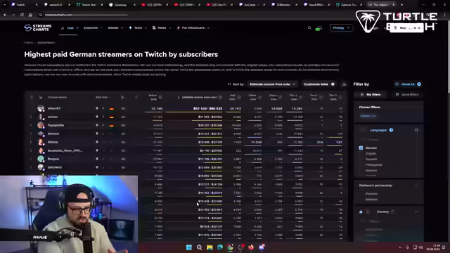 03:47:48Es wird das Erstaunen darüber ausgedrückt, dass an einem Dienstagnachmittag so viele Subs generiert werden, wie manche Streamer im ganzen Monat verdienen, um ihren Lebensunterhalt zu bestreiten. Es wird eine Nachricht aus dem Chat zitiert, die besagt, dass der Streamer die drittmeisten Tier-3-Subs in ganz Deutschland habe. Dies wird mithilfe des Twitch-Trackers überprüft, wobei festgestellt wird, dass der Streamer auf Platz 84 der meistgesubbtesten Kanäle der Welt liegt. Es wird die Anzahl der T3-Subs (56) gefunden und mit anderen deutschen Streamern verglichen, um das Ranking zu ermitteln. Es wird festgestellt, dass der Streamer Platz 6 in Deutschland in Bezug auf T3-Subs belegt. Abschließend wird auf die Diskrepanz zwischen Subzahlen und Zuschauerzahlen hingewiesen und spekuliert, dass viele Subs möglicherweise nicht auf Sympathie beruhen.
