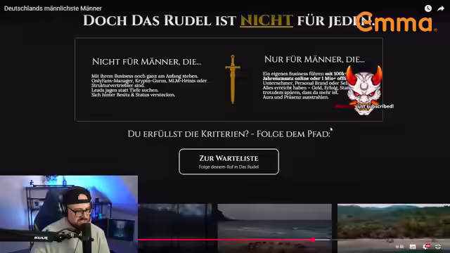 05:04:09Es wird eine Organisation namens 'Das Rudel' vorgestellt, die sich an Unternehmer richtet, die nach 'wahrer Kraft' und 'Männlichkeit' suchen. Die Website präsentiert sich mit einem verwirrenden Headline-Text und einem Image-Video, das suggeriert, dass 99% der Männer 'paule Ratten' seien, denen die Erfahrung einer echten Bruderschaft fehlt. Die Werte des Rudels umfassen Freiheit, Männlichkeit und Bruderschaft, wobei der Fokus auf der Wiederentdeckung der angeblich verlorenen Männlichkeit liegt. Die Website zeigt Bilder von durchtrainierten Männern ohne T-Shirts, Lagerfeuern und einem Zebra-Heli, was an eine Homepage einer VOV-Raid-Gilde erinnert. Kritisiert wird der 'PP-Cringe', der von der Seite ausgeht, sowie die Darstellung von weißen Männern und die unglücklich gewählte Überschrift 'Bring Licht in die Dunkelheit' in Verbindung mit einem Foto von zwei Farbigen. Es wird angemerkt, dass die Adresse dasrudel.org im Jahr 2005 zu einem Forum für Fantasy-Mittelalter-Geschichten gehörte.