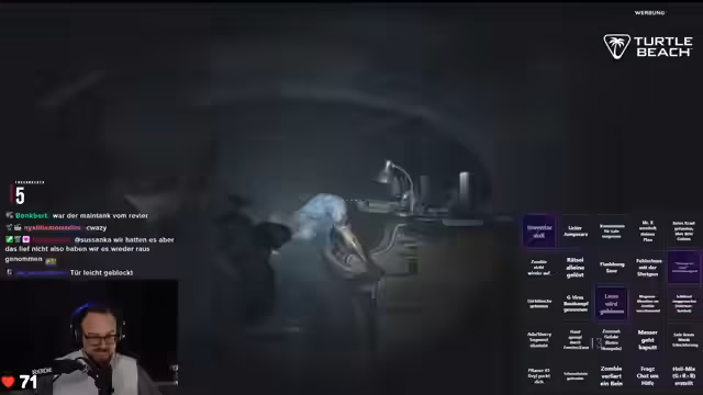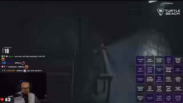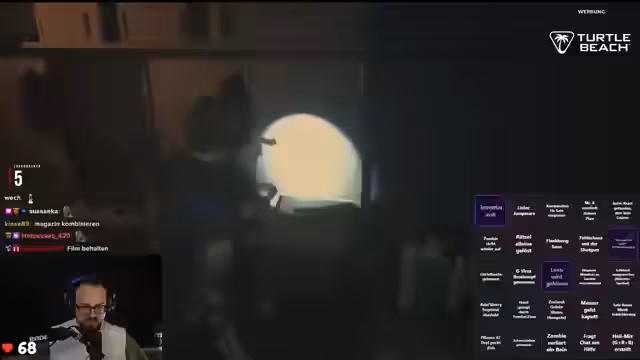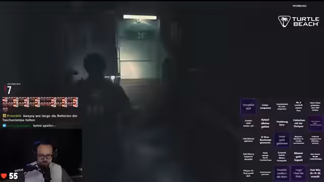04:17:26Der Streamer geht systematisch jeden Raum durch und versucht, zusätzliche Hilfsmittel zu finden. Er ist auf der Suche nach Gegenständen, die ihm weiterhelfen könnten, insbesondere einer Batterie für ein C4-Gerät. Nach stundenlanger Suche findet er schließlich den entscheidenden Hinweis, der ihm den Weg zum Tresor weist. In diesen Momenten der Entdeckung unterbricht er den Stream mehrfach, um Giveaways für Turtle Beach Hardware zu veranstalten, bei dem Follows durch Ausrufezeichen TB im Chat gewonnen werden können.