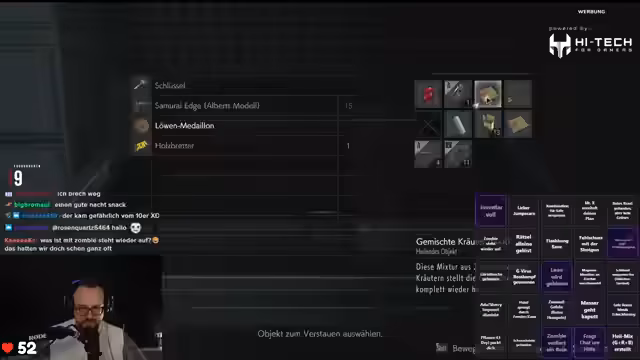 02:59:59Ein Hauptaugenmerk lag dem Lösen von Rätseln, insbesondere das Öffnen von Schreibtischen mit Initialen der Vornamen der Charaktere. Der Streamer benötigte mehrere Versuche, um die richtige Reihenfolge der Buchstaben zu ermitteln und die Schlösser zu öffnen. Gleichzeitig kämpfte er mit der begrenzten Lagerkapazität im Inventar, was dazu führte, dass er Gegenstände wie Messer und Munition verwerfen musste, um Platz für neue Items zu schaffen. Die Kombination von Gegenständen wie Schießpulver und Kräutern war ebenfalls ein wichtiges Element, um im Spiel weiterzukommen und Ressourcen zu nutzen.
