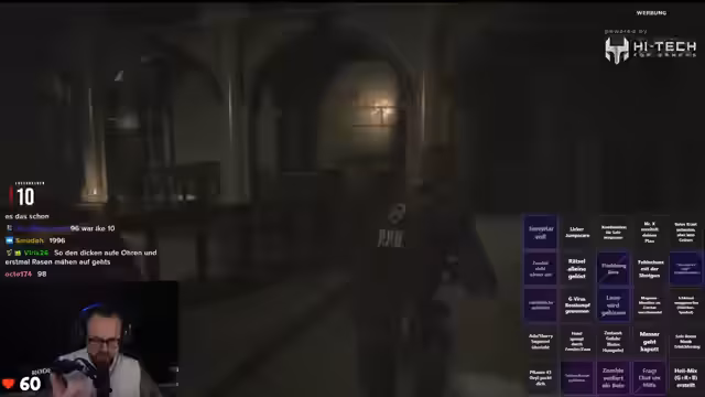 01:55:23Nachdem die technischen Herausforderungen der Pulsmess-Challenge gemeistert sind, beginnt der eigentliche Gameplay-Teil mit Resident Evil 2. Der Streamer spielt als Leon S. Kennedy durch die zombieverseuchte Stadt Raccoon City. Nachdem er zunächst im Polizeirevier ankommt, trifft er auf die Überlebende Claire Redfield, die ihren vermissten Br sucht. Gemeinsam machen sie sich auf den Weg durch die Polizeistation, die voller Gefahren ist. Der Streamer kämpft sich durch Zombie-Horden, sammelt Munition und sucht nach Schlüsseln, während er gleichzeitig auf die Bingo-Aktionen für die Giveaways achtet.